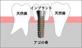 インプラントとは、顎の骨に直接、人工歯根となる金属(チタン)を埋め込む事によって、天然歯に限りなく近い人工の歯を取付け、『食べる』・『話す』といった人間としての自然な機能と、美しく見栄えの良い歯をとり戻すことを目的とした、最新の歯科医療技術です。 この人工歯根に人間の生体と親和性が近いチタンを使用する事によって、ある一定の期間を経て顎の骨に安全にしっかりと結合される事が、長年の研究で証明されています。