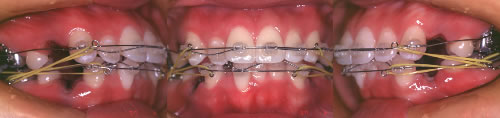 写真4 ワイヤーを装着して歯並びを矯正している、治療中の口腔内写真。