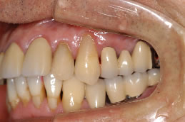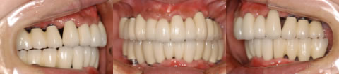 全顎にインプラントブリッジが装着され、審美的にセラミックで回復を施し、美しい笑顔が獲得された。さらに咀嚼機能も改善され患者さんも満足した症例である。