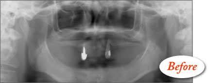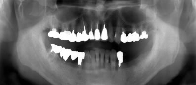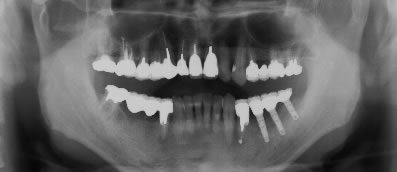 術後のパノラマレントゲン写真では、上顎10本、下顎8本のインプラントが埋入されている事が確認できる。